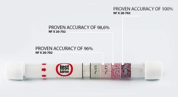 Alkotesty producenta test&drive określają poziom trzeźwości na podstawie koloru, jaki uzyskają kryształki po dmuchnięciu w urządzenie. Urządzenie wskazuje cztery poziomy: 0 promili (zupełną trzeźwość), 0,2 promila (stan „wskazujący na spożycie alkoholu”) i 0,5 promila oraz 0,8 ( (stan nietrzeźwości – kierowcy grozi nawet kara pozbawienia wolności). Jeśli kryształki w środkowej części alkomatu po dmuchnięciu pozostają białe, kierowca jest trzeźwy i może „wsiąść za kółko”. Jeżeli kryształki zabarwią się na którykolwiek z odcieni czerwieni, jazda autem jest zabroniona. Stopień stężenia alkoholu we krwi określa intensywność zabarwienia kryształków