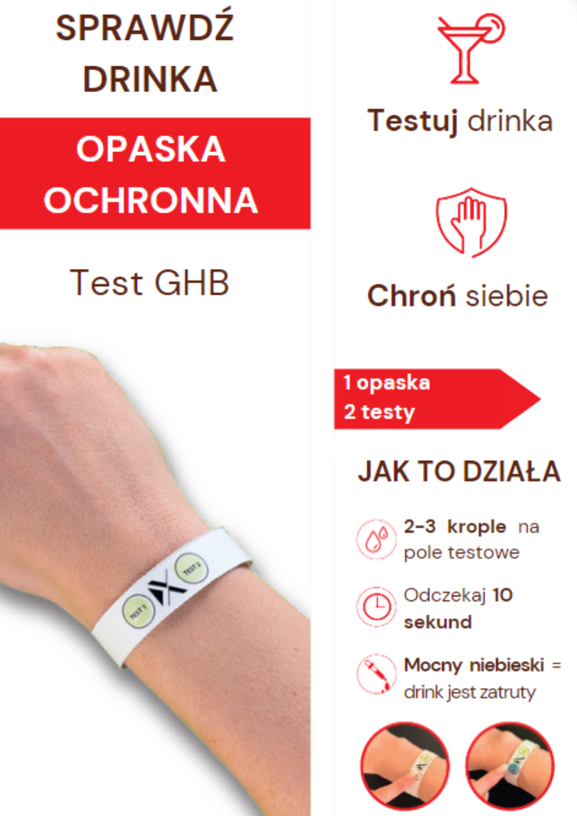 Opaska wykrywająca GHB: Dyskretna i łatwa w użyciu opaska, zaprojektowana do wykrywania obecności GHB (kwas gamma-hydroksymasłowy) w napojach. Wystarczy nanieść krople na pole testowe, zareaguje jeśli substancja będzie obecna, zapewniając szybki i wiarygodny test bezpieczeństwa.