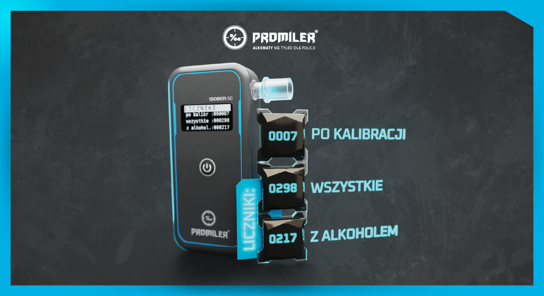 Alkomat PROMILER iSOBER 50 posiada trzy liczniki, które informują o: liczbie pomiarów od ostatniej kalibracji, całkowitej liczbie wykonanych testów oraz liczbie pomiarów z wykrytym alkoholem. Te funkcje ułatwiają monitorowanie prawidłowego użytkowania urządzenia, wspierają terminową kalibrację i pozwalają na analizę statystyk. Jest to praktyczne rozwiązanie zarówno dla użytkowników indywidualnych, jak i instytucjonalnych, gdzie dokładna ewidencja pomiarów jest niezbędna.