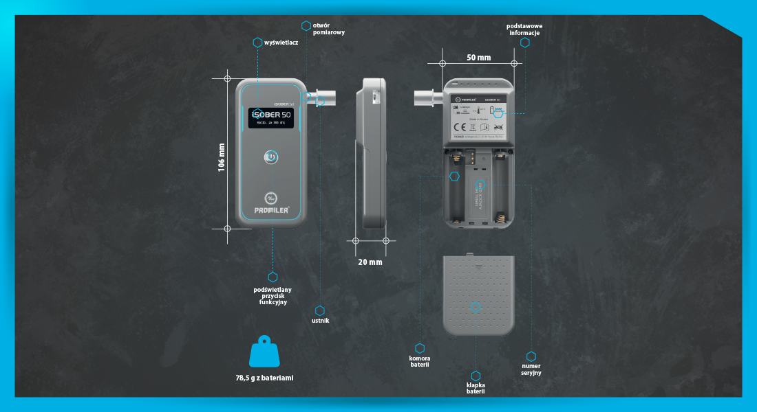 1. Świeżo skalibrowany i gotowy do użycia alkomat PROMILER iSober 50